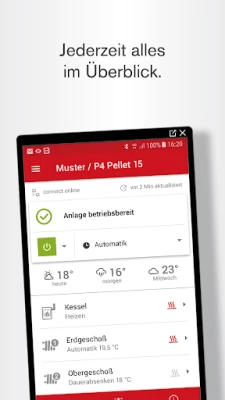 Mit der Fröling Connect App kontrollieren und überwachen Sie Ihren Fröling Heizkessel online, jederzeit und von überall. Erhalten Sie sofort eine Übersicht des Anlagenzustands und ändern Sie wichtige Einstellungen bequem. Passen Sie Benachrichtigungen für Wartung und Störungen individuell an.